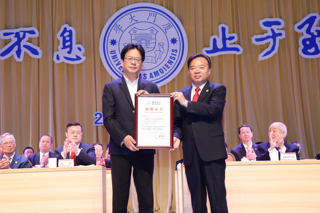 一流大学离不开海内外校友和社会各界人士无私的关爱。在过去的一年,又有一批充满爱心的校友和朋友向厦大伸出了慷慨捐赠之手。我们要借校庆大会这个重要的时刻向他们表示我们由衷的感谢和崇高的敬意。我们知道,这每一分的捐赠都代表着一个期望,每一分的捐赠都是推动我们不断向前永不止步的动力,我们一定要用好这每一分的善款,一定不辜负各位校友、各位朋友的殷切期望,把学校的各项事业不断向前推进。在这儿,我也建议,我们再一次鼓掌,向各位捐赠者表示衷心的感谢!