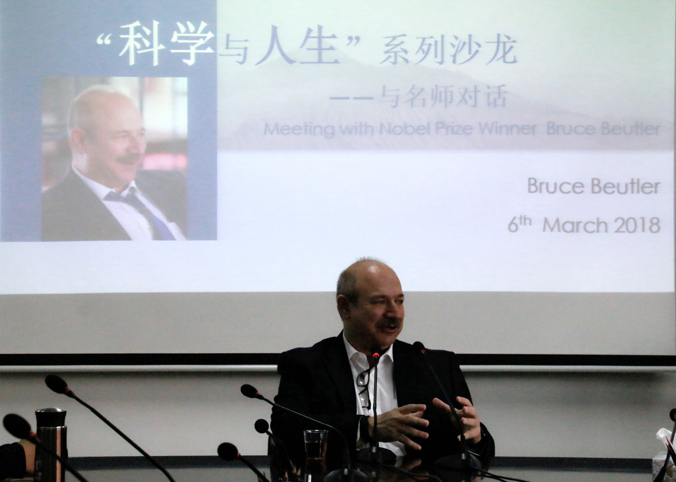 3月1日,在博伊特勒书院拔尖班学生热烈期盼中,博伊特勒教授以《免疫学研究进展回顾》报告为博伊特勒书院新学期的《细胞信号传导》课程拉开序幕;3月5日,他又来到黄朝阳楼五楼学术报告厅为拔尖班学生及其他学院师生带来了《通过随机失活小鼠体内基因研究免疫系统》讲座,讲座现场有问有答,气氛活跃。来自台湾长庚大学2018级博伊特勒书院拔尖班学生蔡宗霖感慨道:“大一时我就慕名参加过他的一场讲座,而如今能如此近距离的接触他,并成为他的学生,对于我来说是非常幸运了。”博伊特勒教授在来厦短短的几天时间里把日程排的满满的,总计为师生带来了一场沙龙、一堂课程、一场讲座、三场旁听课程,大半的时间都与学生在一起。为了满足中国学生的授课需求,博伊特勒教授亲自设计并实施了博伊特勒书院拔尖班高级课程。他最终选定四门课程:《高级遗传学》、《免疫学》、《细胞信号传导》和《英文写作与报告》,其中《英文写作与报告》是专门针对中国学生的薄弱环节而设。除了课程,博伊特勒书院拔尖班的师资力量更是“奢侈”。豪华的教师队伍中,包括一名诺奖得主、数位美国科学院院士、英国皇家院士和来自牛津大学、布鲁塞尔大学等高级学府的资深教授。曾经在同一个餐桌上中,出现了17位学生和4位老师,这4位老师则分别是诺奖得主、牛津大学教授、剑桥大学教授和哈佛大学毕业的教授。2018年入选博伊特勒书院拔尖班的我校杨艺同学说道:“从没想过自己能不出国门就享受到如此高规格的师资水平,尤其是当博伊特勒教授作为‘旁听生’坐在我们身边一同听课,那种感觉棒极了。”