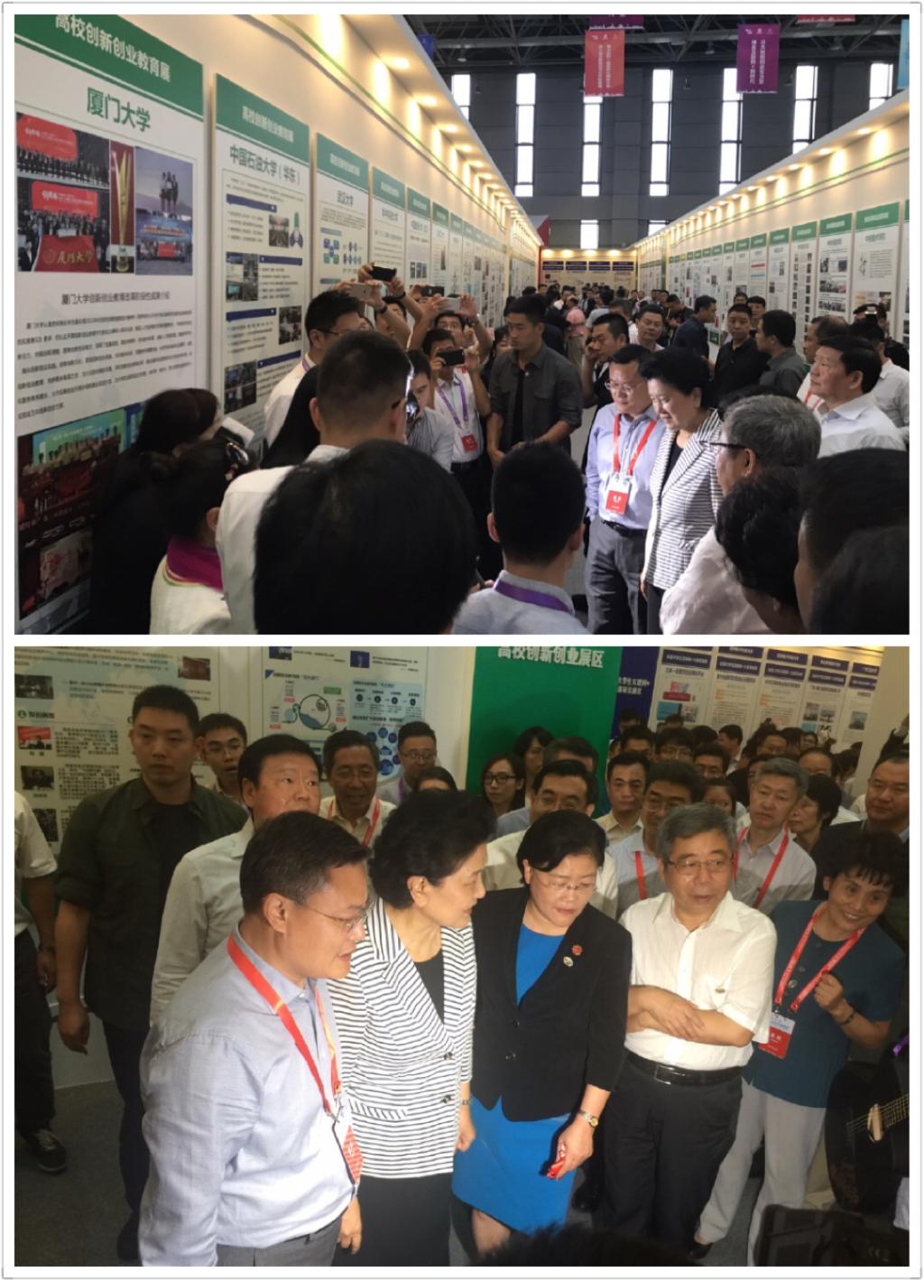 决赛期间,中共中央政治局委员、国务院副总理刘延东在教育部部长陈宝生等领导的陪同下来到我校展区,听取了校长张荣关于我校创新创业工作开展情况的汇报,并亲切接见金奖获奖师生。管理学院2014级本科生新疆维吾尔族艾萨·阿尤普作为全国14个代表之一,应邀参加“青年红色筑梦之旅”演讲报告会,向刘延东副总理作了《感恩祖国扎根西部为中国梦而创业》演讲报告,汇报了学习习近平总书记回信精神的感想与体会,以及参加“青年红色筑梦之旅”实践活动的经历与心得。福建省副省长杨贤金、福建省教育厅厅长黄红武等领导看望慰问了我校参赛师生,我校校长张荣、校党委林东伟副书记到现场对参赛师生予以指导和鼓励。林东伟还接受了新华社的专访,介绍宣传了我校创新创业工作开展情况。