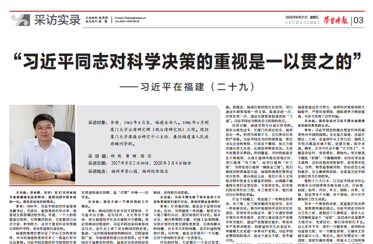 8月21日,《学习时报》刊发“习近平同志对科学决策的重视是一以贯之的”——习近平在福建(二十九),本期采访对象是厦门大学港澳台研究中心主任,兼任福建省人民政府顾问等职的李非教授。厦门大学在前一阶段认真学习系列采访实录的基础上,及时组织教师跟进学习,不断深化对习近平新时代中国特色社会主义思想历史逻辑、理论逻辑、实践逻辑的认识和领会,教师们纷纷结合自身学习工作实际,开展研讨交流,畅谈感想体会。