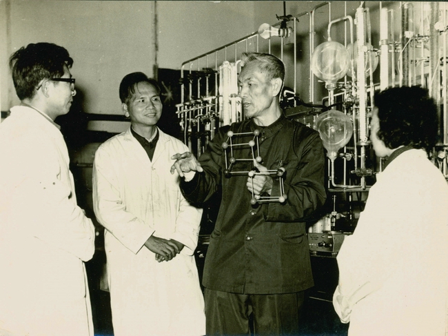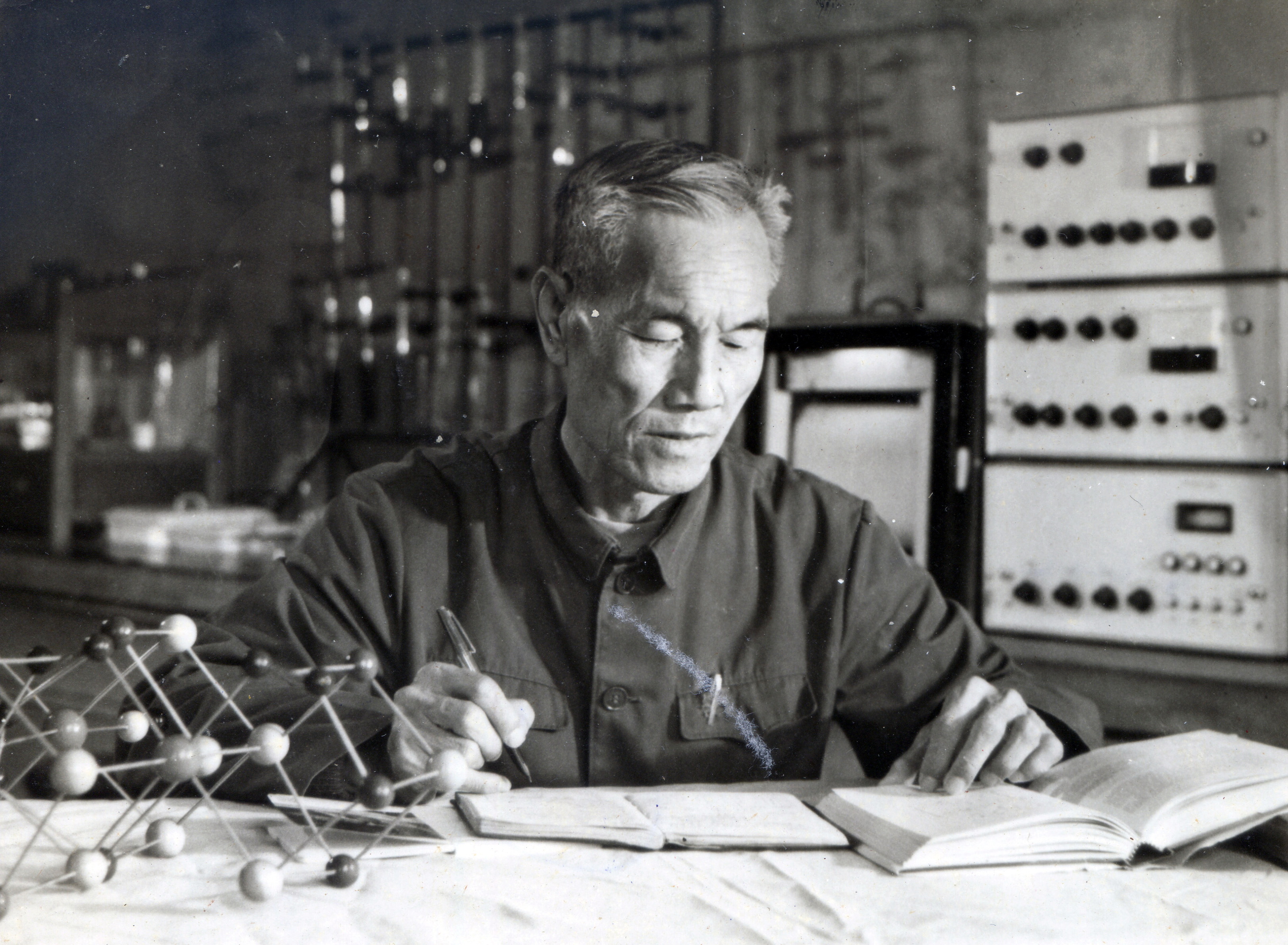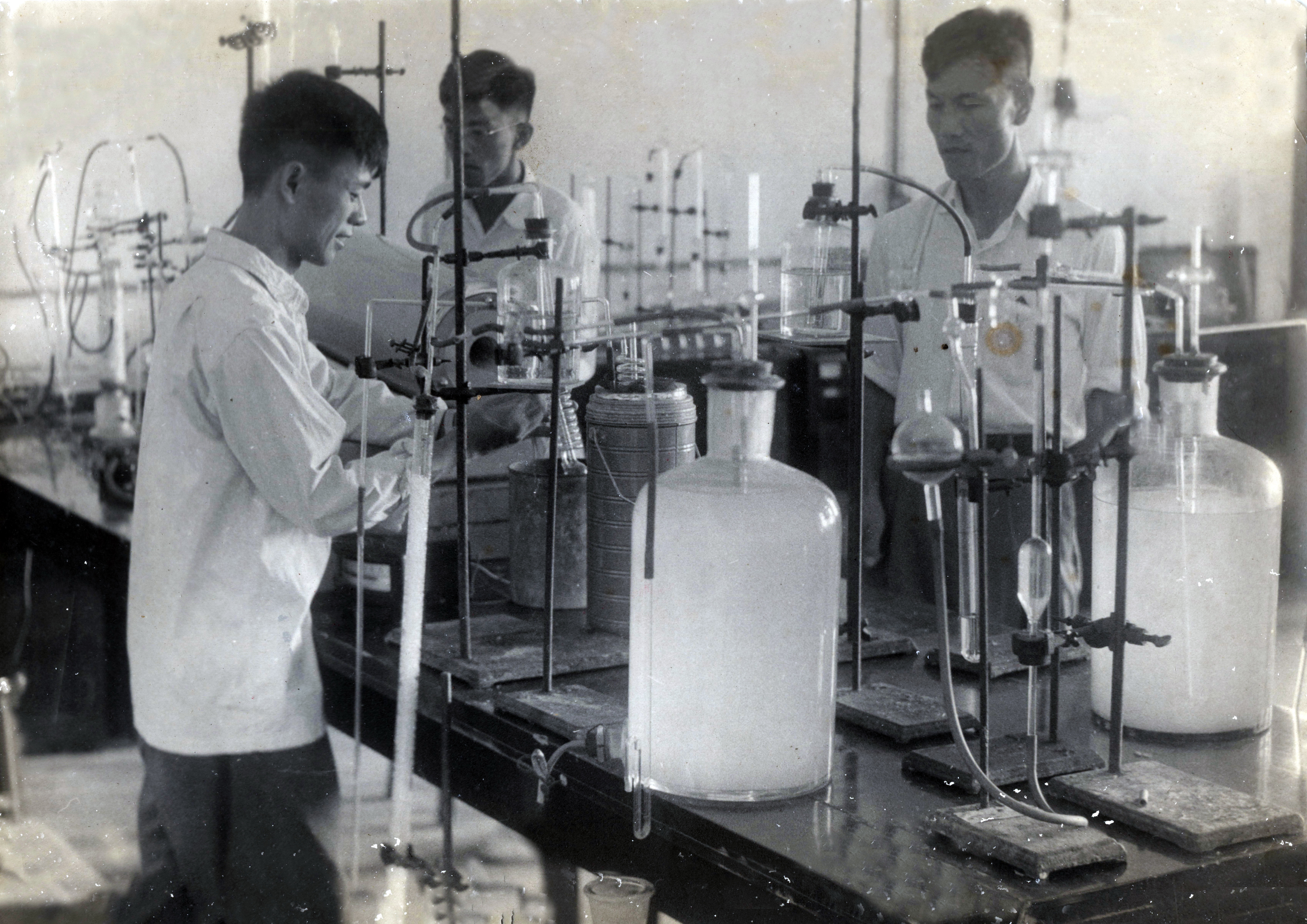 1956年,回国返校的蔡启瑞先生(右)在实验室指导学生黄开辉(左)做催化实验。