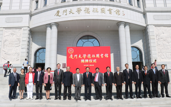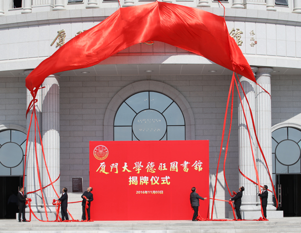 11月3日上午,厦门大学德旺图书馆揭牌仪式举行。福耀玻璃集团董事长曹德旺,校党委书记张彦、校长朱崇实、全国政协书画室委员、著名书法家、国学家、厦门大学客座教授、厦门大学德旺图书馆题字书家张瑞龄,校图书馆馆长萧德洪、学生代表陈家辉共同为图书馆揭牌。