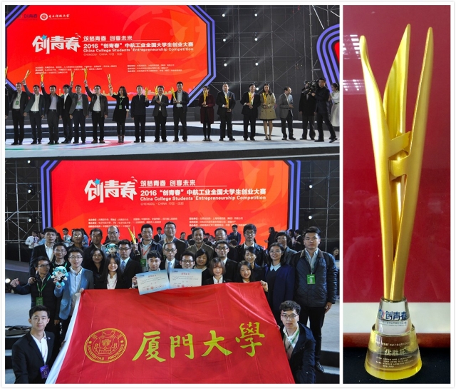 11月15日至19日,由共青团中央、教育部、人力资源和社会保障部、中国科协、全国学联、四川省人民政府联合主办的2016年“创青春”(原“挑战杯”)全国大学生创业大赛在成都市电子科技大学举办。经过激烈角逐,我校代表团取得2金3银1铜的优异成绩,总积分位于全国高校前列,再次捧得大赛“优胜杯”(全国仅有20所高校获此殊荣),并获“高校优秀组织奖”,再创参赛佳绩。其中,由物理与科学技术学院2014级硕士生梁添、管理学院2015级硕士生吴丹担任负责人的《厦门桑德科技有限公司》、软件学院2013级本科生李秀东担任负责人的《厦门爱图视界科技有限公司》获得金奖,由医学院2015届博士毕业生王燊担任总经理的《厦门弧形世界医疗科技有限公司》、管理学院2014届硕士毕业生郭奇担任CEO的《厦门云境智能科技有限公司》、医学院2014级本科生陈漳鑫担任负责人的《厦门医宝贝教育咨询有限公司》获得银奖,生命科学学院2011级博士生王震担任董事长的《厦门安提海拉科技有限公司》获得铜奖。
