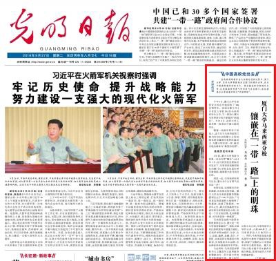 今日,《光明日报》在头版开设“中国高校走出去”专栏,开篇之作即为我校马来西亚分校,题为“厦门大学马来西亚分校:镶嵌在‘一带一路’上的明珠”。