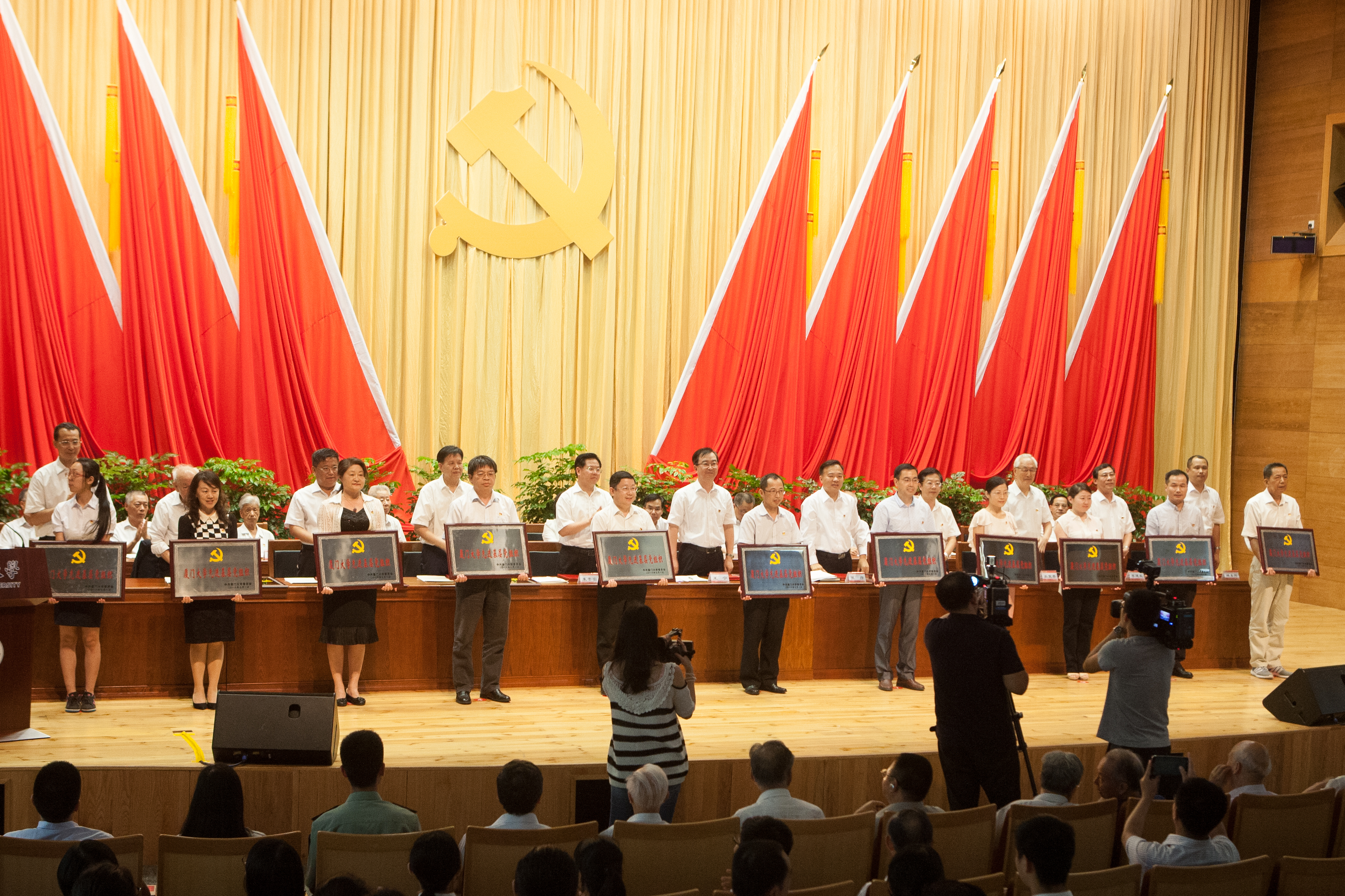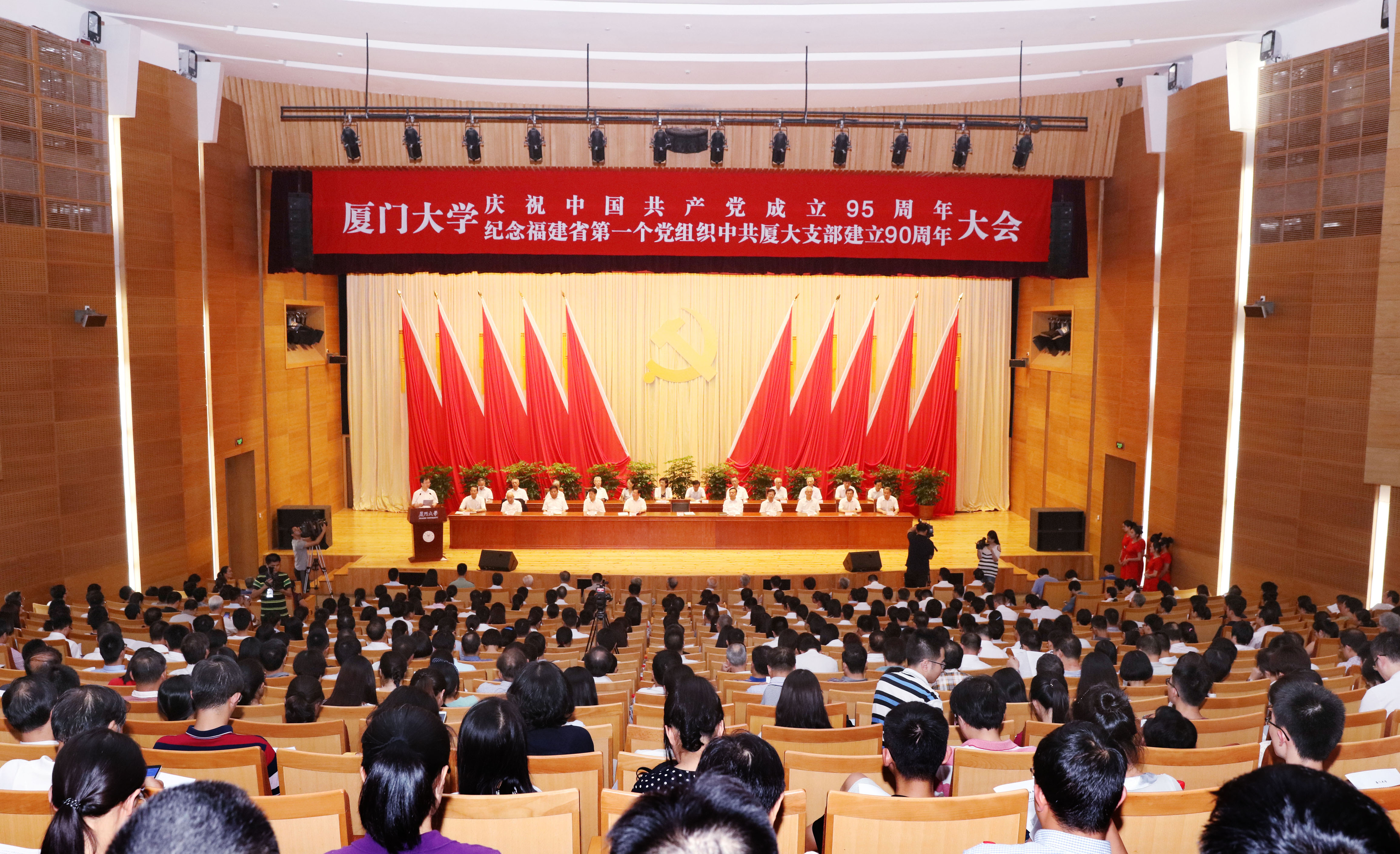 7月1日下午,学校在科学艺术中心隆重召开厦门大学庆祝中国共产党成立95周年暨纪念福建省第一个党组织中共厦门大学支部建立90周年大会,表彰先进、树立典型、鼓舞斗志、凝聚人心,进一步加强学校党的建设,进一步推动学校事业科学发展。福建省委常委、组织部长王宁,厦门市委常委、组织部长陈秋雄代表省委、市委出席大会。校党委常委、校行政领导、校长助理、学校老领导、党员院士、文科资深教授、解放前参加工作的老党员代表在主席台就座。大会由校长朱崇实主持。
