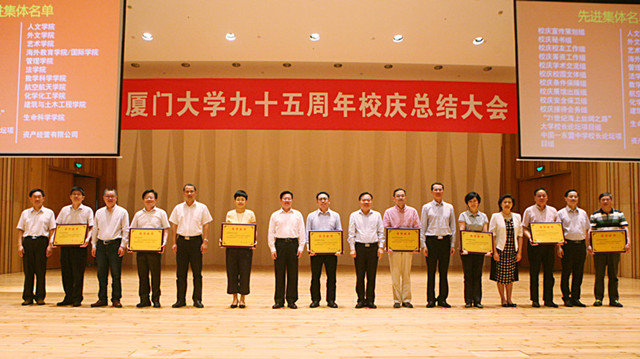 5月20日,厦门大学95周年校庆总结大会在科学艺术中心音乐厅隆重举行。大会表彰了在校庆活动中表现突出的24个先进集体、222名优秀工作者和406名优秀志愿者。校党委书记张彦、校长朱崇实等校领导和校长助理为获奖代表颁奖。校党委副书记林东伟宣读表彰决定。校党委副书记、副校长李建发主持大会。