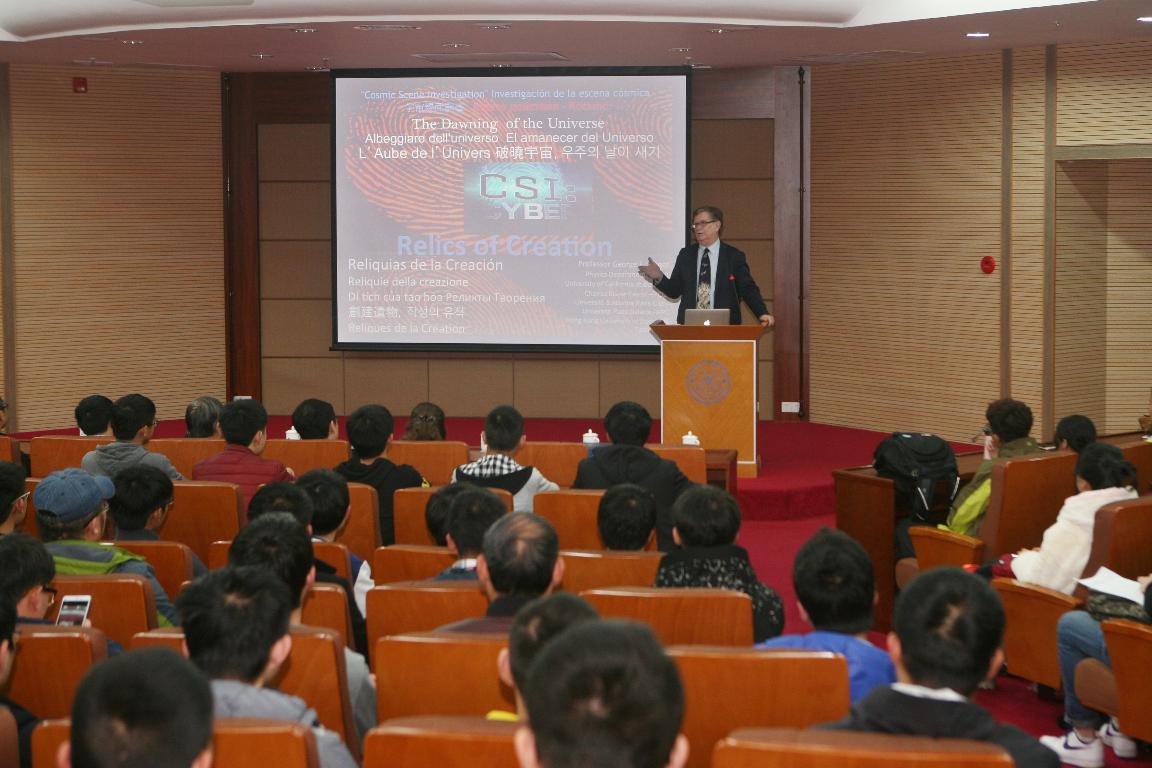 在讲座中,George Smoot教授在演讲中以时间和空间为线索,带领现场师生一同探索宇宙的奥秘。他以自己多年的研究为基础,阐释了研究宇宙微波背景辐射的原因,并用丰富的图片和视频介绍了观测宇宙微波背景辐射的原理与工具,特别是COBE、WMAP、PLANCK三颗探测卫星以及它们传输回来的图像,并在依据宇宙微波背景辐射理论及观测结果建立的宇宙形成与变化的模型的展示分析中,为听众剖析复杂的宇宙世界。George Smoot教授对抽象物理概念的生动诠释让听众印象深刻。讲座结束后,George Smoot教授与广大师生面对面地交流,耐心回答了许多提问,现场气氛热烈。