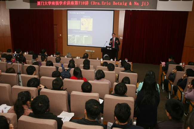 Eric Betzig作题为“Imaging Life at High Spatiotemporal Resolution”的专题讲座。在长达一个半小时的讲座中,Eric与大家分享了光敏定位显微镜(PALM)这一研究成果的研究经历和他颇为传奇的科研生涯。1994年,Eric曾一度放弃科研,当过全职奶爸和汽车配件厂的机械工程师。2005年他关注到光活化绿色荧光蛋白,他立刻敏锐地意识到他早在1995年提出的光活化定位显微成像技术(PALM)的设想可以成为现实。这促使他鼓起勇气重新进入学界。在短短6个月的时间内,他便与光活化绿色荧光蛋白发现者Jennifer Lippincott-Schwartz,George Patterson等科学家一同利用该荧光分子特殊的开关效应,以时间换空间研制PALM显微镜,用纳米级的空间分辨率清楚地观察到细胞的若干生理现象。而这正是他获得诺奖的关键。讲座最后,Eric还介绍了自己的最新技术——双通道自适应光学格栅光片显微镜(Lattice Light Sheet Microscopy with Two Channel Adaptive Optics)的研究进展。