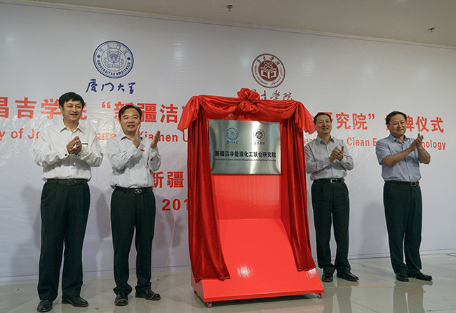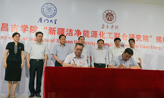 7月6日上午,“厦门大学—昌吉学院新疆洁净能源化工联合研究院”揭牌和厦门大学、昌吉学院合作协议签字仪式在新疆维吾尔自治区昌吉学院举行。自治区政协副主席刘建新、教育厅副厅长张国辉、昌吉回族自治州州委书记李建国、福建省对口援疆前方指挥部总指挥谢毅泰,以及新疆中泰化学股份有限公司等相关单位负责同志出席仪式。厦门大学党委书记张彦,副校长叶世满,化学化工学院(醇醚酯化工清洁生产国家工程实验室)专家团队袁友珠、陈秉辉、王沈扬,学校办公室、发展规划办公室、科技处、社科处等单位有关同志组团出席活动。