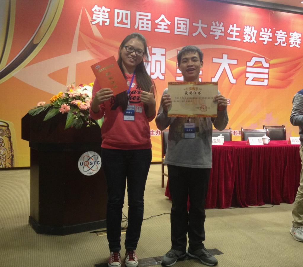 3月16日,第四届全国大学生数学竞赛决赛在成都电子科大举行。我校数学科学学院组织选派的3位学生进入了最后的决赛,数学科学学院11级本科生钟齐先、10级本科生吴璇双双喜获数学专业类一等奖,位列全部参赛选手的第11、12名,本次大赛排名前19名均为一等奖。来自信息科学与技术学院的曹亨同学喜获非数学专业类二等奖的第二名。