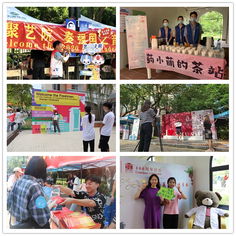 学校各相关单位亦全力保障迎新工作的有序推进。学校迎新指挥部大屏上清晰地显示着各院系的报到人数、比例情况,已到校学生的性别分布、校区分布、学习层次、生源地分布等信息一目了然。保卫处联合大学路派出所在三家村设立迎新咨询点,设置宣传展板、摆放禁毒模型、分发防诈骗等宣传手册,为新生开展安全教育宣传。德旺图书馆开展“云导览”新服务,通过直播的方式带领新生参观图书馆,既安全健康,又贴合“00后”新生的交流方式。厦大易班在三家村广场设置展台,假期参与打卡的新生可前往兑换奖品,并手书明信片展开大学畅想。后勤集团同往年一样为新生提供免费凉茶等服务,还通过展板倡导“厉行节约、反对浪费”新风尚。