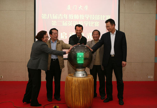 在热烈的掌声中,赖虹凯宣布第八届青年教师教学技能比赛暨第二届英语教学比赛启动,邬大光、林永生、计国君、邓净阳共同启动共同点亮了启动球。