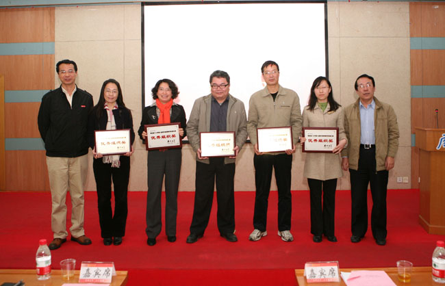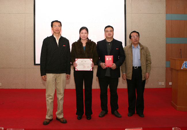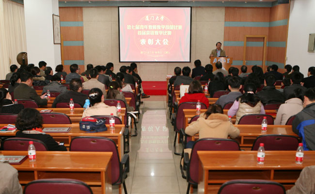 计国君教授宣布厦门大学第七届青年教师教学技能比赛获奖名单和厦门大学首届英语教学比赛获奖名单,并对教学比赛的进一步深化提出了几点建议。随后,到会的领导为受表彰的单位和个人颁奖。