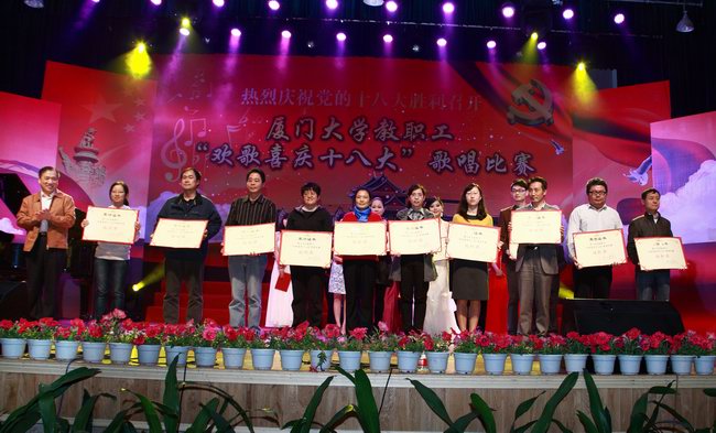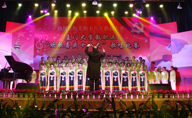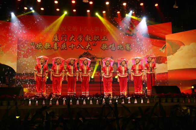 11月25日晚,建南大会堂歌声嘹亮,鼓乐喧天,由校工会主办的厦门大学教职工“欢歌喜庆十八大”歌唱比赛决赛在这里隆重举行。本次歌唱比赛预赛的举行正值党的十八大胜利召开之际,全校教职员工积极响应,共有来自19个部门工会的50余名选手参加预赛角逐,16名选手(组合)进入了决赛,于今晚一决高下。这是一场高手如云的比赛,参赛选手们以青春激情唱响祖国颂歌,展示厦门大学教职工们热爱党、热爱祖国的精神风貌。