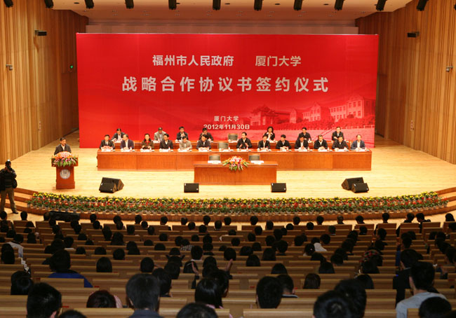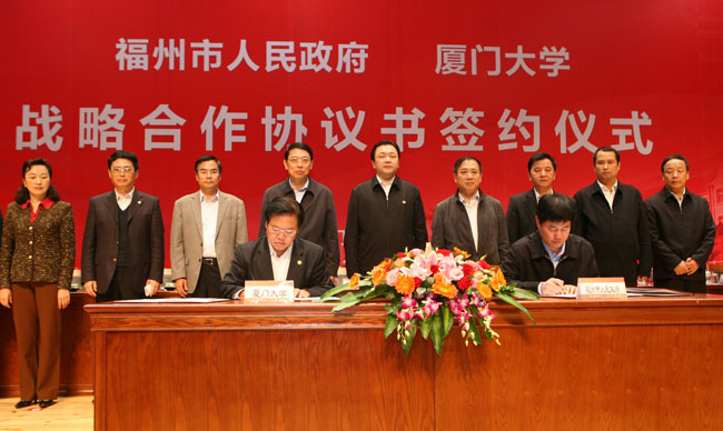 11月30日下午,福州市人民政府与厦门大学战略合作协议签约仪式在科学艺术中心音乐厅举行。此举标志着双方长期稳定的战略合作伙伴关系由此建立,今后双方将进一步发挥各自优势、加大合作力度、促进共同发展,为加快建设海峡西岸经济区做出更加突出的贡献。
