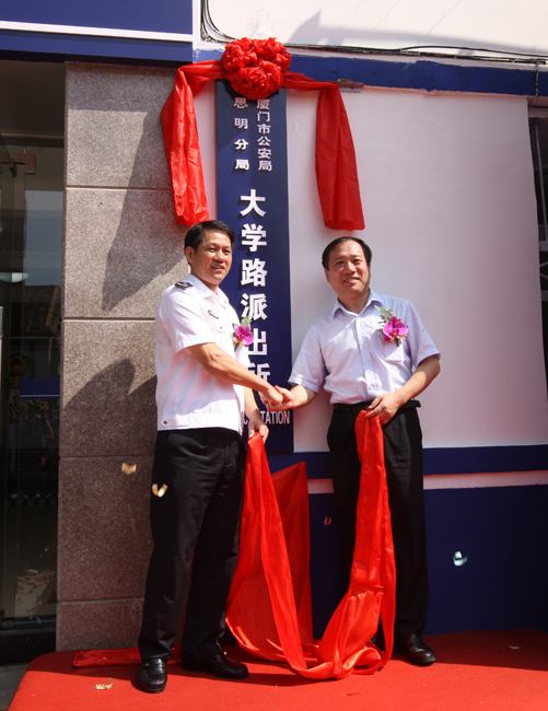 10月12日上午,大学路派出所正式揭牌。校党委书记杨振斌,校党委副书记、纪委书记陈国凤,厦门市公安局副局长范锦昌,思明区政府区长黄乔生,区人大常委会主任许跃生,区委副书记、组织部长郑一琳,区委常委、政法委书记陈高润、区政府副区长柯玉宗,区政协副主席赖晓明等出席了揭牌仪式。