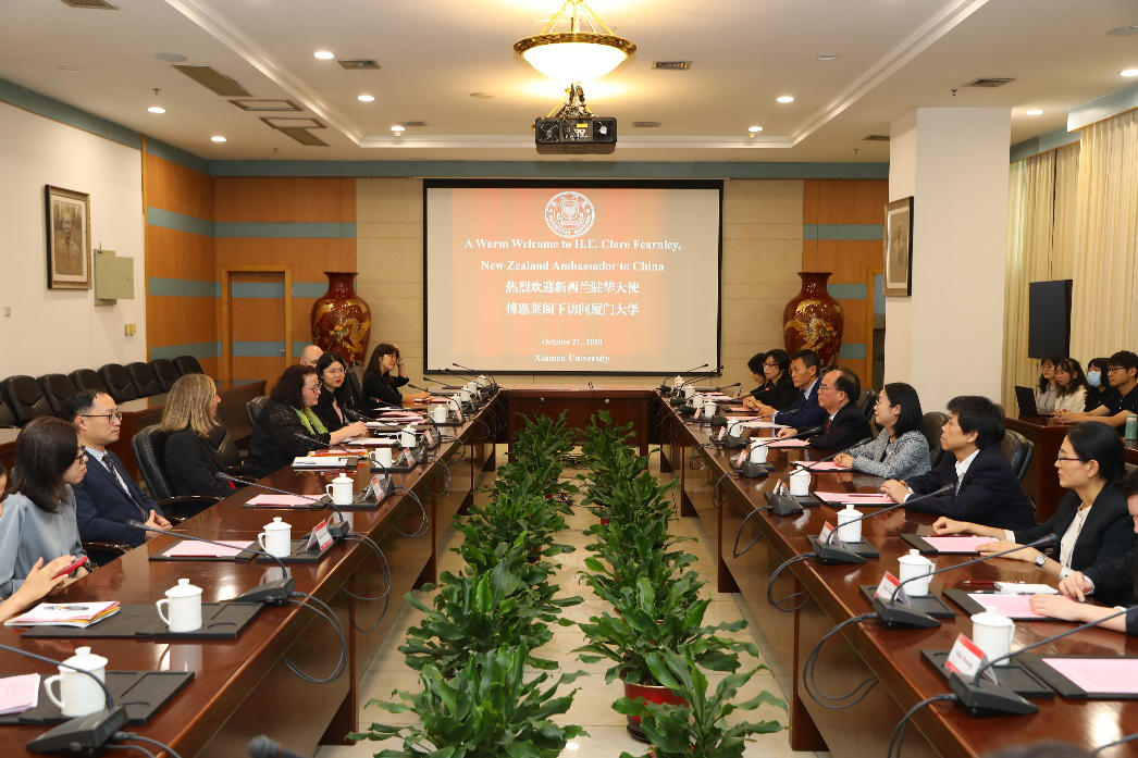 张荣欢迎大使来访,并介绍我校办学历史与国际化办学情况。他表示,厦门大学历来重视对外开放,与新西兰多所高校友好交流,建立良好的合作关系。厦门与惠灵顿结为友城,厦门大学与惠灵顿维多利亚大学共建孔子学院,姐妹校合作成果显著。希望在驻华大使馆的关心与支持下,进一步拓宽与新西兰高校的交流合作,就人才培养、国际化交流、学术研究、优势学科合作等领域密切联系,实现高等教育共赢发展。
