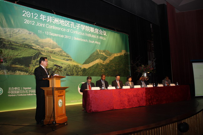 来自非洲26个国家(地区)的30余所孔子学院(课堂)以及11所中国合作院校的代表出席了2012非洲地区孔子学院联席会议。与会者在为期3天的会议上围绕如何促进孔子学院更好地融入大学和社区、制订孔子学院发展规划和加强本土师资培训等议题进行了深入的研讨和交流。会议期间举行的晚会上,我校艺术学院的师生和南非各孔院的学生还表演了精彩的文艺节目,受到观众的热烈欢迎。