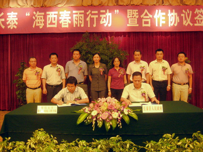 7月22日,厦门大学长泰“海西春雨行动”暨合作协议签字揭牌仪式在漳州市长泰县连氏大酒店隆重举行。我校党委副书记陈力文、长泰县人民政府县长吴卫红出席仪式。应邀出席仪式的还有校党委统战部部长林辉、校学生工作部部长林东伟、校教务处处长谭绍滨、物理与机电工程学院院长吴晨旭、物理与机电工程学院党委副书记杨旸、校团委副书记陈怀锋、党外专家教授等。仪式由长泰县委常委、统战部部长詹伟主持。我校物理与机电工程学院院长吴晨旭与长泰县人民政府副县长蔡美山分别代表双方在协议上签字。