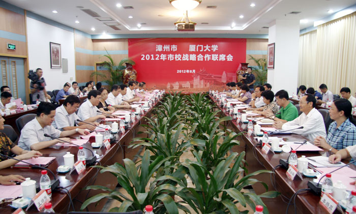 8月14日下午,我校与漳州市2012年市校战略合作联席会议在颂恩楼215会议室举行。漳州市委书记陈冬和我校党委书记杨振斌分别致辞。双方总结交流近年来市校合作情况,研究探讨下一步合作事宜。双方表示,要深入贯彻落实省委九届五次全会精神,加强沟通交流,继续深化战略合作,推动市校共赢发展,以新的成绩迎接党的十八大胜利召开。