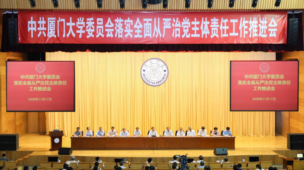 11月17日下午,学校党委在科学艺术中心报告厅召开落实全面从严治党主体责任工作推进会,深入学习贯彻习近平总书记关于全面从严治党的重要讲话重要指示批示精神,贯彻落实中共中央办公厅印发的《党委(党组)落实全面从严治党主体责任规定》和教育部党组、福建省委工作部署,进一步压紧压实全校基层党委管党治党责任。校党委书记张彦出席会议并代表党委讲话。会议由党委副书记赖虹凯主持。教育部直属高校党建工作联络员陈子辰,福建省纪委监委秘书长陈志斌,福建省委组织部二级巡视员林敏先,福建省委教育工委、省教育厅二级巡视员陈晓风等出席会议。