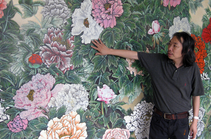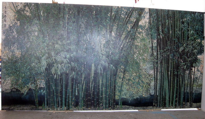 在随后的日子里,陈金华和他的助手、学生们把心思都用在这幅画上,按照他的话说,“少则四、五人,多则八、九人,为了节省路途时间,干脆就和学生租住在五缘湾附近了”,这么大的一幅画作,每一道工序做完,都要等它风干,才能进行下一道,每一道工序,都要想着怎么跟后面的工序相衔接。团队中每个人的工作,都要与其他人的工作相配合、协调一致,画面的整体视觉效果要把握,画面上各个部分的色彩浅淡要把握、创作时各种材料穿插呼应的拿捏要把握、局部的琐碎细节更是要把握。“很多东西都是在具体画的时候逐步完善的,工作量这么大,我们每天只能完成巴掌大的一块,说实在话,这几个月我心里是比较忧虑的,有点发毛,总怕实际效果与预想的有很大差距。”陈金华如是说。
