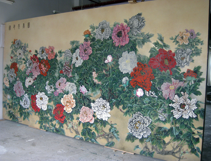 5月14日下午,在陈金华的带领下,记者在工作室内见到了这两幅画作,第一眼望去时,气势恢宏,一股大气油然而生,立在工作室内的这两幅画作分别画在一个长5米多,高近3米的画芯两面,一面是《国色天香图》,56朵牡丹争奇斗艳、五彩斑斓,象征着56个民族团结友爱、携手前进,一面是《青翠云霄图》,青青的翠竹节节攀高直挂云霄,代表着中华民族的气节,反映着改革开放以来人民节节高的幸福生活。