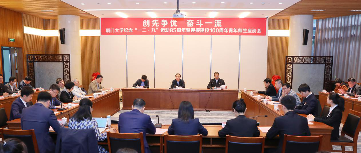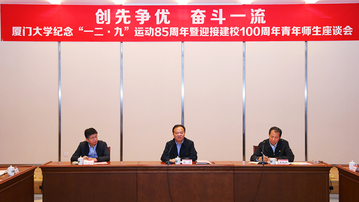 座谈会上,化学化工学院教授侯旭、环境与生态学院教授史大林、信息学院教授纪荣嵘、台湾研究院教授张羽,航空航天学院2016届博士生聂泳忠、管理学院2020届硕士生李文娟、人文学院2018级硕士生洪佳敏、海洋与地球学院2017级本科生姚程成、数学科学学院2018级本科生张晟君、嘉庚学院2017级本科生封耀焯等10名在教学科研、社会服务等方面取得优异成绩的先进个人和团体代表先后发言,围绕“创先争优、奋斗一流”主题,结合自身经历,分享追求卓越、成长成才的心得体会,表达爱国、求真、励志、力行的决心。大家表示,“一二·九”运动凝聚起的爱国主义精神如今依旧光芒闪耀。面向“十四五”,奋进新百年,厦大青年大有可为,也必将大有作为,要勇敢肩负起时代赋予的重任,爱国奋斗、志存高远,在学校“双一流”建设中提升能力、作出贡献;青年教师要勇于创新创造,做走在新时代前列的奋进者、开拓者、奉献者,在科学研究和教书育人道路上砥砺前行,当好学生成长“引路人”;青年学生要树立远大抱负,练就过硬本领,努力奉献国家社会,用自己的不断奋斗助力中国梦的实现。