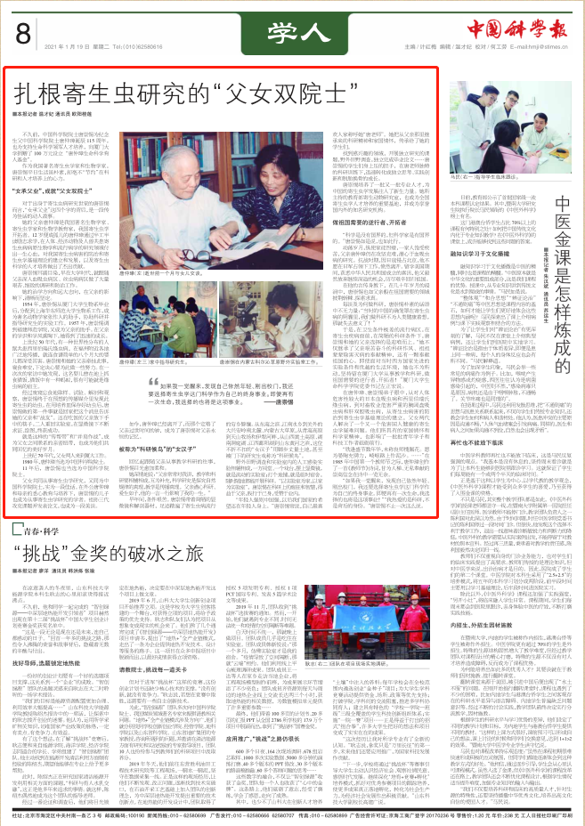 中国科学报1月19日第八版刊发人物通讯《扎根寄生虫研究的父女双院士》,从“女承父业,成就父女双院士”,“”被称为科研候鸟的女汉子”“做祖国需要的逆行者、开拓者”三个层次,生动展示唐仲璋、唐崇惕院士艰苦奋斗的科研作风、奉献祖国的感人故事。这也是百年校庆系列科研人物深度通讯在中国科学报的第三次亮相。