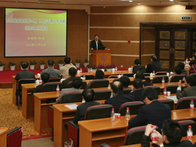 2011年12月31日下午,党委党校第94期学习班交流总结大会暨结业式在克立楼三楼报告厅举行。校长朱崇实出席会议并做总结讲话,强调指出,我们要进一步认识文化的重要性,牢牢把握文化自觉、文化自信与文化自为,努力传承与弘扬厦大的优秀文化,推动学校科学发展、跨越发展。校党委副书记陈力文,副校长赖虹凯,校长助理王巧萍、韩景义、叶世满、陈应鑫以及全校副处级以上干部参加会议。大会由党委党校副校长苏劲主持。