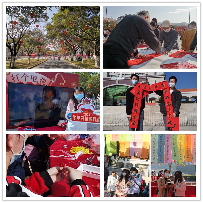 今年,学校以“喜迎百年新征程”为主题,严格落实疫情防控规定,线上线下互动,继续组织开展“我们的节日·春节”系列活动。在嘉庚广场,“春暖百年,传承民俗”民俗体验游园活动与新春茶话会同期举行,校党委副书记徐进功宣布游园会开始。活动邀请多位老师现场写春联、剪纸,为师生送上新春祝福;设置猜灯谜、编织中国结、远程拜年等环节,邀请广大师生参与。此外,校园主干道悬挂灯笼、中国结、贴新春海报、挂新春横幅、摆喜庆盆栽,新春的氛围逐步浓烈。据悉,除夕当天,学校将采用“堂食+外带”“分散就餐”“错峰用餐”等方式组织留校师生围炉团聚、喜迎新年。学校还将在线上开展“我们的节日·元宵”花灯设计大赛暨“云灯会”活动,让广大师生进一步增强对传统文化的了解和认同,坚定文化自信,进一步厚植家国情怀。