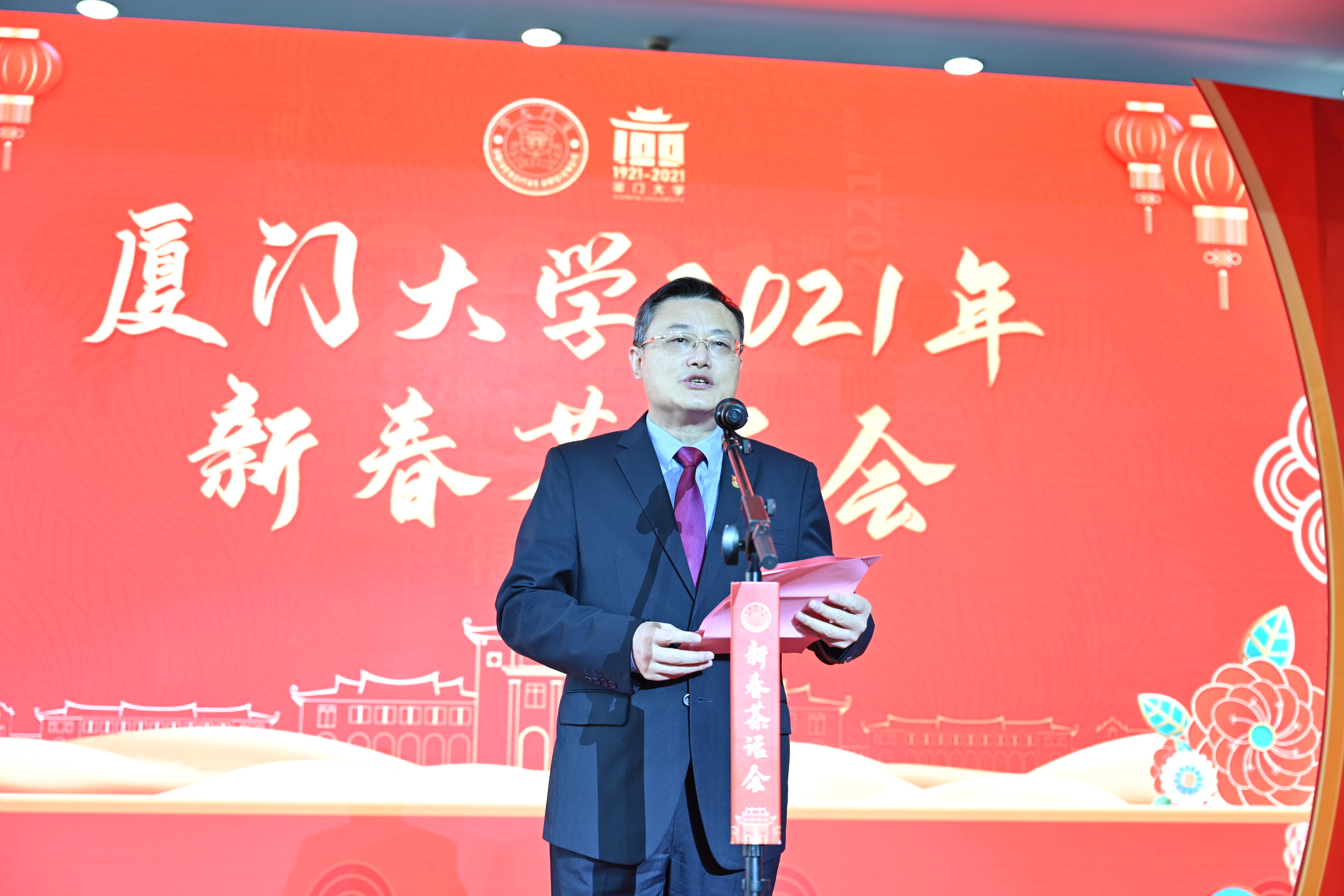 张彦在主持中指出,2021年是中国共产党成立100周年,是“十四五”规划的开局之年,是开启全面建设社会主义现代化国家新征程的起始之年,也是厦门大学建校100周年。在新的时期,要以习近平新时代中国特色社会主义思想为指引,深入贯彻落实党的十九届五中全会精神,紧密团结广大师生、校友和社会各界人士,在农历牛年大力发扬为民服务孺子牛、创新发展拓荒牛、艰苦奋斗老黄牛的精神,攻坚克难、担当作为,弘扬嘉庚精神、奋进一流征程,推动学校进一步实现高质量内涵式发展,用扎根中国大地建设世界一流大学的新气象、新成就迎接建党百年、建校百年,奋力书写实现中华民族伟大复兴中国梦的厦大篇章!