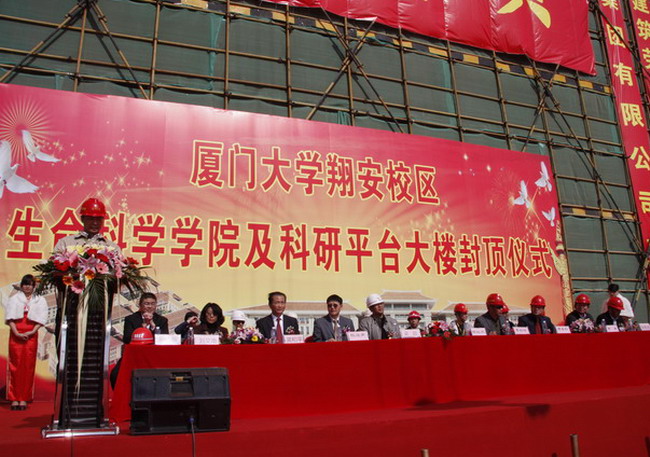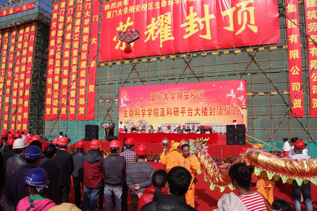 1月10日上午,翔安校区生命科学学院及科研平台大楼封顶仪式在校区大楼工地隆重举行。在礼炮和锣鼓声中,我校副校长赖虹凯,校长助理李初环,生命科学学院院长林圣彩、院党委书记黄田、副院长宋思扬,翔安校区代建单位厦门路桥建设集团有限公司副总经理梁超,厦门中宸集团有限责任公司董事长杜煌南、总经理黄和平,东南大学建筑设计研究院工程部主任刘又南、厦门勤奋建设工程监理有限公司总经理郑建智共同为封顶装载混凝土。