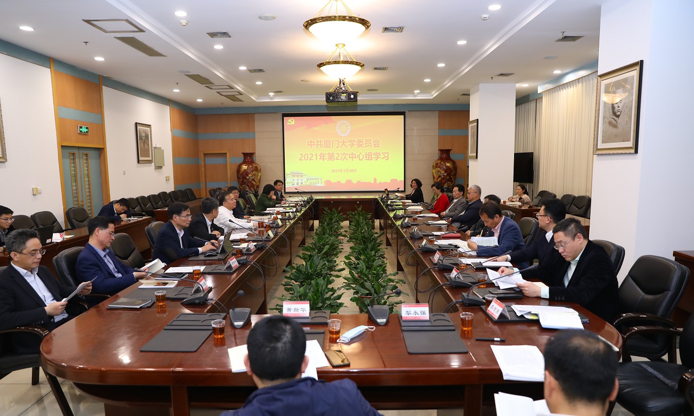 3月10日晚,中共厦门大学委员会2021年第二次中心组学习会在颂恩楼215会议室召开。本次学习会围绕“弘扬嘉庚精神,奋进一流征程”主题,集中学习习近平同志关于厦门大学事业发展重要指示批示特别是关于“弘扬嘉庚精神”“培养一流人才”的要求,结合校史学习党史,从习近平同志关心关怀厦门大学的具体事例体会总书记关于教育重要论述的深刻内涵。校党委书记张彦主持学习会。
