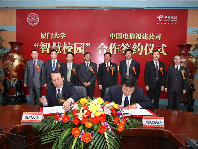 11月24日上午,我校与中国电信福建省公司“智慧校园”通信及信息化项目合作签约仪式在颂恩楼215会议室举行。我校校长朱崇实和中国电信福建省公司总经理段建祥分别致辞,副校长邬大光与中国电信福建省公司副总经理高金兴代表双方在协议书上签字。