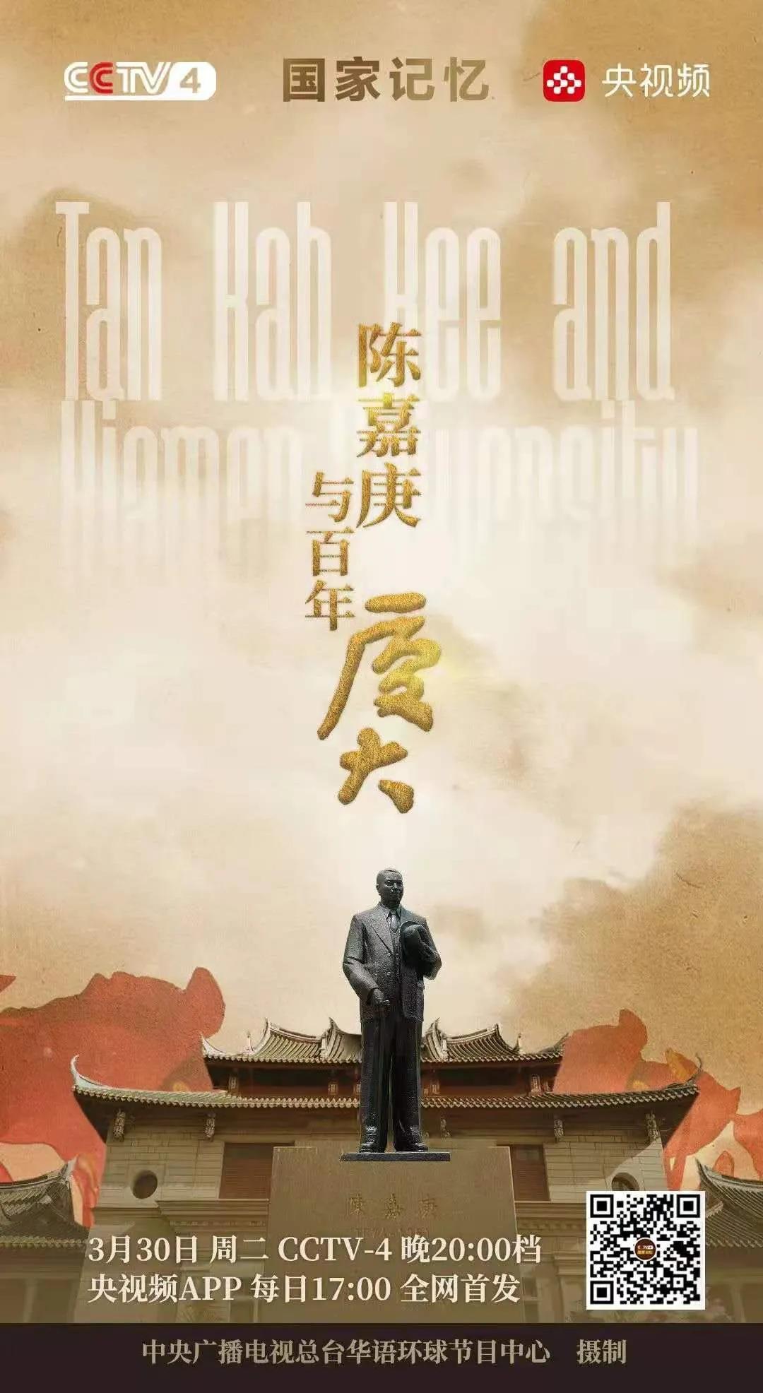 中央广播电视总台《国家记忆》栏目推出的厦门大学建校100周年三集纪录片《陈嘉庚与百年厦大》将于3月30日、31日和4月1日,每晚20:00在CCTV-4分别播出一、二、三集。