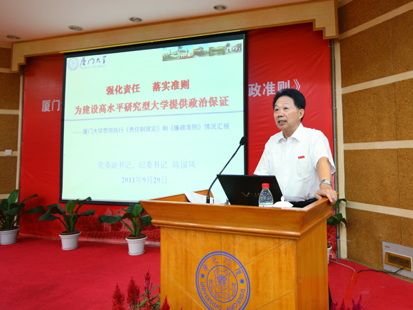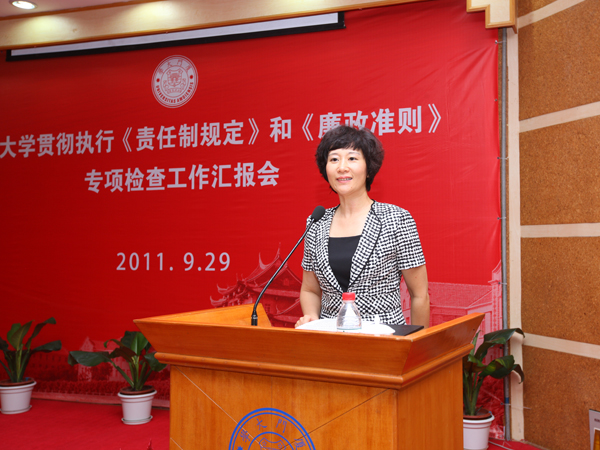 陈国凤指出,在上级党委、纪委的领导和指导下,学校党委长期以来高度重视党风廉政建设和反腐败工作,始终坚持“党委统一领导、党政齐抓共管、纪委组织协调、部门各负其责、依靠师生员工支持和参与”的党风廉政建设领导体制和工作机制,努力做好“一个抓手、两个始终、三个坚持、四个机制”,即以深入落实党风廉政建设责任制为总抓手;始终做到抓改革发展稳定坚定不移,始终做到抓党风廉政建设和反腐败工作坚持不懈;坚持以全面加强领导班子作风建设为重点,坚持以贯彻落实《廉政准则》和教育部《十不准》规定为主要内容,坚持以建立健全惩治和预防腐败体系为总体目标;健全责任落实机制、创新宣教机制、规范运行机制、创新督查机制,为全面提高教育质量,建设世界知名高水平研究型大学提供强有力的政治保证。