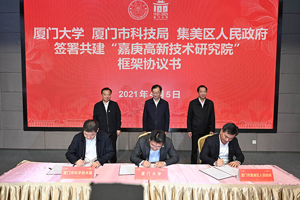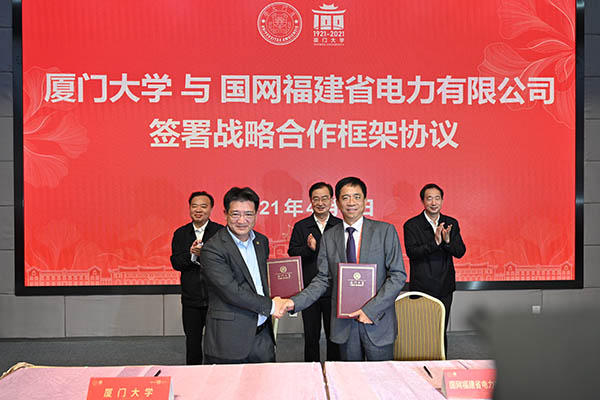 厦门大学与国网福建公司在会上签署了战略合作协议,围绕服务实现“碳达峰、碳中和”目标,共同参与绿色学校投资、建设和运营,致力打造绿色学校先进典型;与厦门市科学技术局、集美区政府签署共建“嘉庚高新技术研究院”框架协议书,共同推进金砖国家创新基地建设;与厦门市政府合作共建的厦门大学电影学院揭牌,打造创新型、高层次、复合式电影人才培养高地。