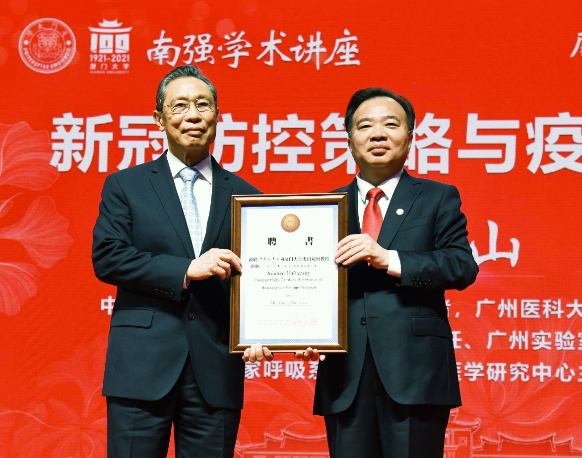 4月6日下午,厦门大学百年华诞之际,中国工程院院士、“共和国勋章”获得者钟南山教授受聘厦门大学杰出访问教授,并应邀在建南大会堂举行南强学术讲座。校党委书记张彦为钟南山院士颁发聘书及南强学术讲座纪念牌。副校长周大旺主持仪式。