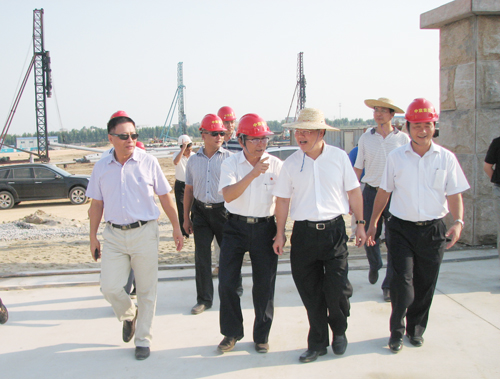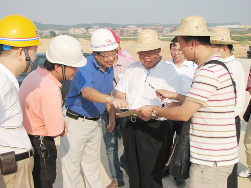 在翔安校区工地,朱崇实先后视察了主楼群、学生公寓、生命科学学院、医学院、药学院、公共卫生学院等在建项目,现场听取了项目经理、施工企业总经理的进展汇报。他表示,学校非常欢迎有实力、善管理的施工企业来校参与建设,对于这些与学校合作良好、为学校做出贡献的施工企业,学校将在未来的建设项目中尽可能的创造参建条件。朱崇实还特别强调安全问题,要求各参建单位要高度重视安全建设,要加强现场管理,要齐抓共管,多方配合,努力创造和谐文明的施工环境。
