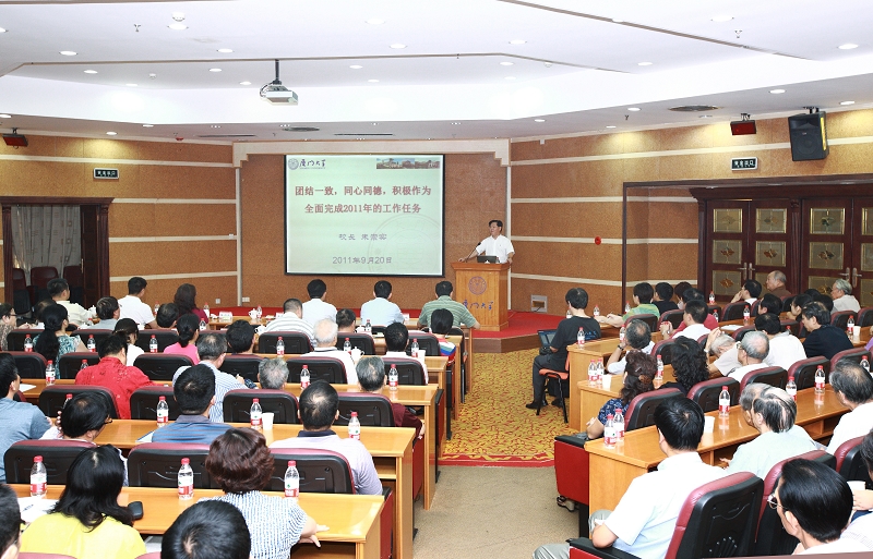 9月20日下午,校长朱崇实在学校中层干部会上总结上学期工作,并对本学期工作要点做了说明,要求全校上下紧紧围绕提高高等教育质量这一中心,团结一致,同心同德,积极作为,全面完成2011年的工作任务。
