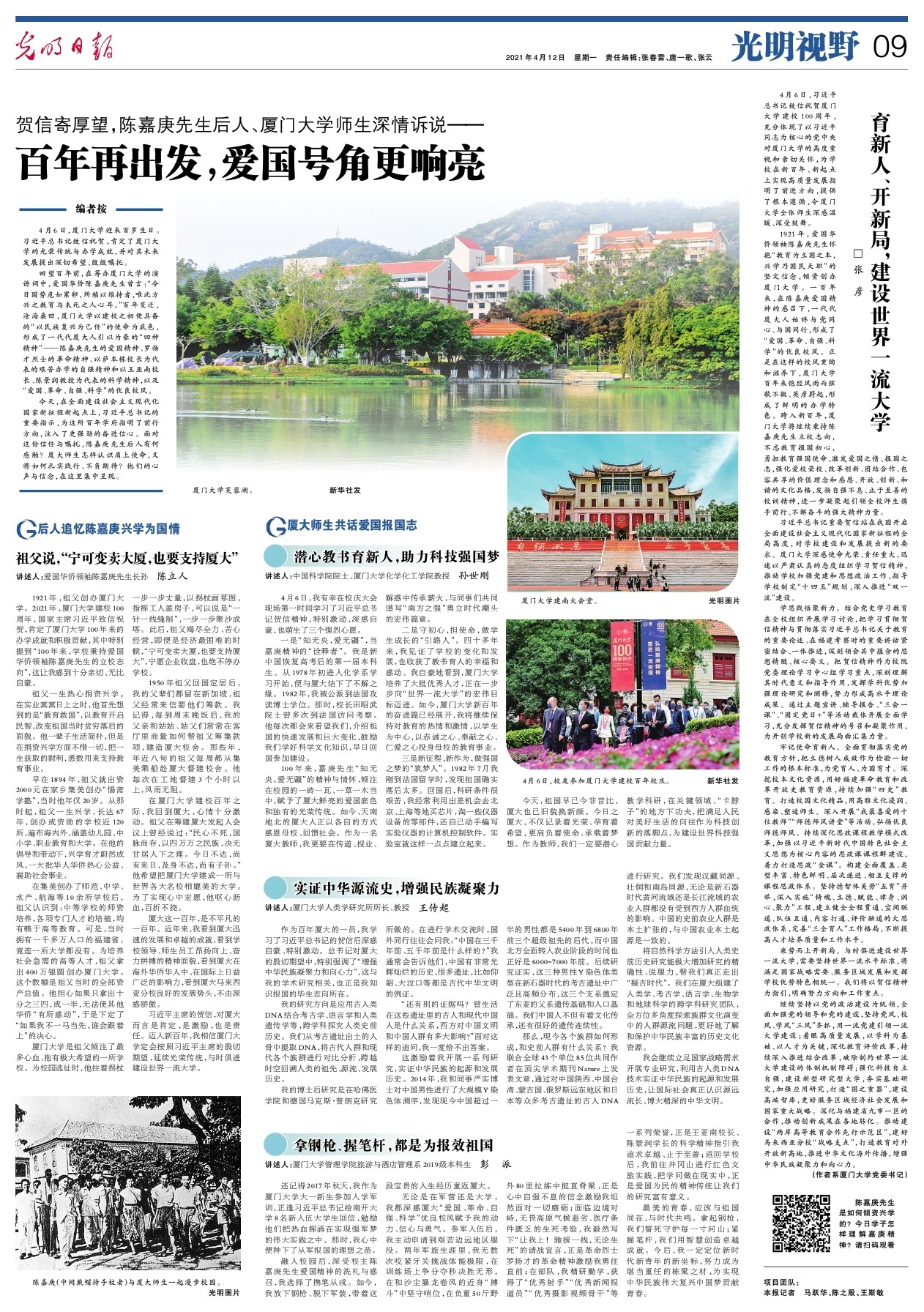 4月12日,《光明日报》第九版以“贺信寄厚望,陈嘉庚先生后人、厦门大学师生深情诉说——百年再出发,爱国号角更响亮”为题,整版刊发厦大百年校庆有关稿件。