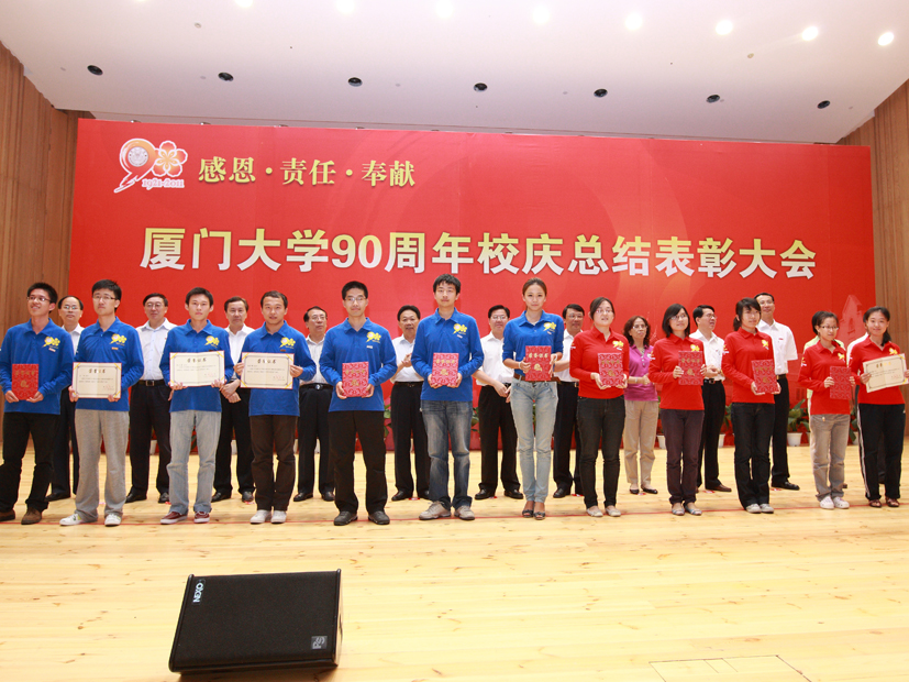 6月9日下午,90周年校庆总结表彰大会在科艺中心音乐厅隆重举行,大会表彰了在校庆活动中表现突出的24个优秀集体、263名优秀工作者和408名优秀志愿者。校党委书记朱之文、校长朱崇实等校领导和校长助理为获奖代表颁奖。校党委副书记陈力文宣读表彰决定,副校长孙世刚主持大会。