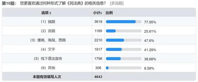 报告显示,受访者了解《民法典》信息的形式主要倾向于视频,比例高达77.95%,明显高于漫画、海报、图画(占比47.6%)与文字(41.29%)等形式。由此凸显,视频已经成为最受民众关注的传播形式。