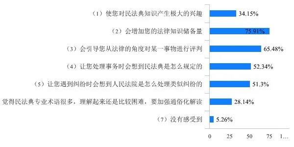 51.32%受访者表示遇到纠纷时会想到人民法院是怎么处理的,这说明民法典能否得到顺利实施,不仅仅是法律条文规定内容,更重要的意义是这些规定在现实能不能得到执行。