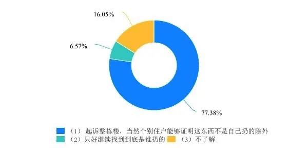 受访者对《民法典》部分内容的认知也能看出宣传效果。在关于“被高空抛物但没办法找到是谁扔的,受害者该怎么办”的问题中,选择“起诉整栋楼,当然个别住户能够证明这东西不是自己扔的除外”的受访者达77.38%,反映出民众对“高空抛物”责任问题的认知程度较高,民法典传播工作效果不错。