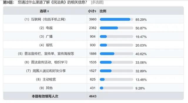 关于了解《民法典》的渠道,报告显示,互联网最高达85.29%。电视渠道次之,占比50.85%。广播、报纸占比都非常低,近占比20%左右,不仅远低于互联网与电视,甚至远低于普法宣传栏、普法宣传活动、周围人谈论与分享。由此可见,互联网和电视是当前民法典传播的主要渠道。