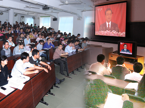 4月24日上午,在物理与机电工程学院报告厅,我校辅导员代表、学生代表和马克思主义理论研修班全体学员集中观看了庆祝清华大学建校100周年大会实况转播,认真学习胡锦涛总书记的重要讲话。 随着大会的进程,全体观看转播的老师同学们认真聆听,全心感受会议的庄严与隆重,并一次次报以热烈的掌声。胡总书记的重要讲话在师生中引起了强烈反响,师生们纷纷表示,胡总书记的讲话体现了党和国家对高等教育事业的高度重视,对青年学生的亲切关怀和殷切期望,大家受到极大的激励和鼓舞。