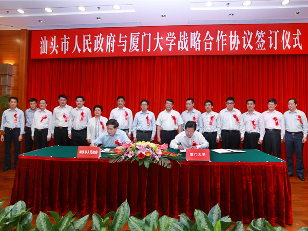 4月28日,我校正式与广东省汕头市建立战略合作关系,当天上午,汕头市人民政府与厦门大学战略合作协议签订仪式在汕头市委大楼1楼西会议厅举行。校党委书记朱之文和汕头市委书记、市人大常委会主任李锋分别致辞。校长朱崇实与汕头市委副书记、市长蔡宗泽代表市校双方在协议书上签字。今后,市校双方将按照优势互补、共同发展、务实高效、互利双赢的原则,在战略发展研究、科技合作、教育事业、文化建设研究等方面开展合作,并在框架协议的基础上建立市校战略合作联席会议制度和部门对接落实机制,加强联络沟通、落实各合作项目,把长期稳定的战略合作伙伴关系不断向前推进。