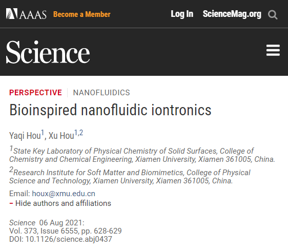 2021年8月6日,厦门大学化学化工学院和物理科学与技术学院的双聘教授侯旭团队受美国《科学》期刊邀请,以“Bioinspired Nanofluidic Iontronics”为题发表了Perspective文章,剖析新兴的仿生纳流离子学在未来人工智能、脑机接口技术中的巨大潜能(Science, 2021, 373, 628)。文章重点介绍了近年来纳流离子学的发展历程,提出了仿生科学将成为纳流离子学发展的新趋势,并展望了仿生纳流离子学在人工智能、脑机接口与类脑智能等跨学科交叉领域的广阔应用前景。